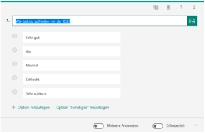 Bei Auswahl können mehrere Optionen zu einer Frage zur Verfügung gestellt werden. Falls erwünscht, können auch mehrere Antworten erlaubt werden.